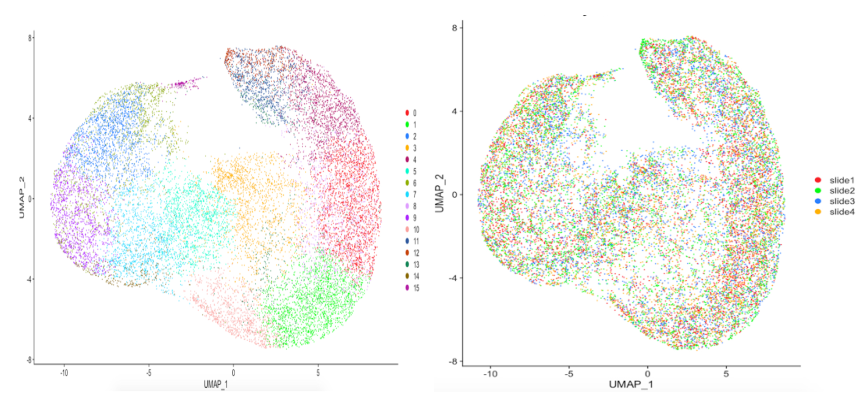 UMAP對樣本進行批次效應分析,可視化展示16個樣本空間基因表達聚類可視化圖。