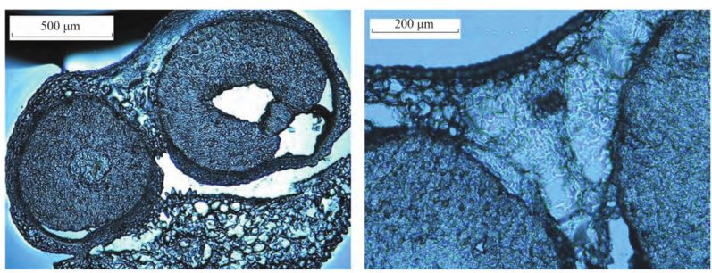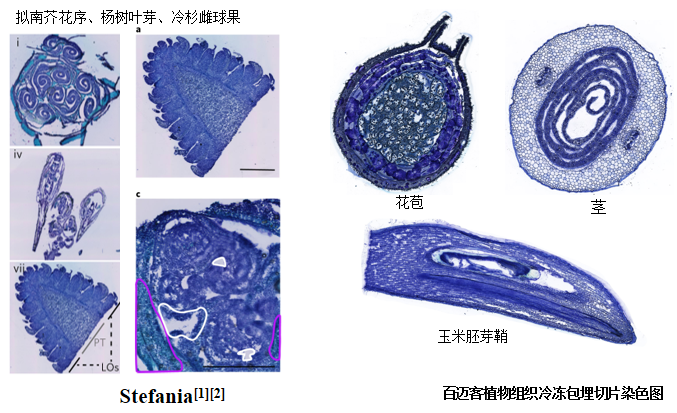 動物組織常用HE(蘇木精-伊紅染色法 ( hematoxylin-eosin staining ))染色,可以精準識別組織形態(tài)和病理學鑒定。然而植物的組織存在的纖維素和一些木質素不適合HE染色方法,采取的是甲苯胺藍染色法,其基本原理是植物組織木質化細胞壁呈藍綠色,其他組織成分呈紫藍色,可以精準輔助判斷植物組織形態(tài)學和確定捕獲區(qū)域。