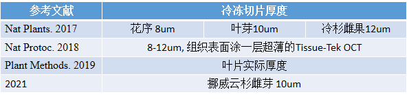 動物組織樣本細胞類型,結構相對比較簡單,切片厚度比較統(tǒng)一,基本上保持在10μm厚度左右。但是植物樣本組織結構復雜,而且木質化程度不一,組織相對RNA含量較低,因此植物切片厚度一般根據(jù)樣本類型不同,選擇不同的切片厚度,一般植物冷凍切片厚度范圍為10-50um,根據(jù)物質組織類型切片厚度會有所不同,視具體情況而定。
