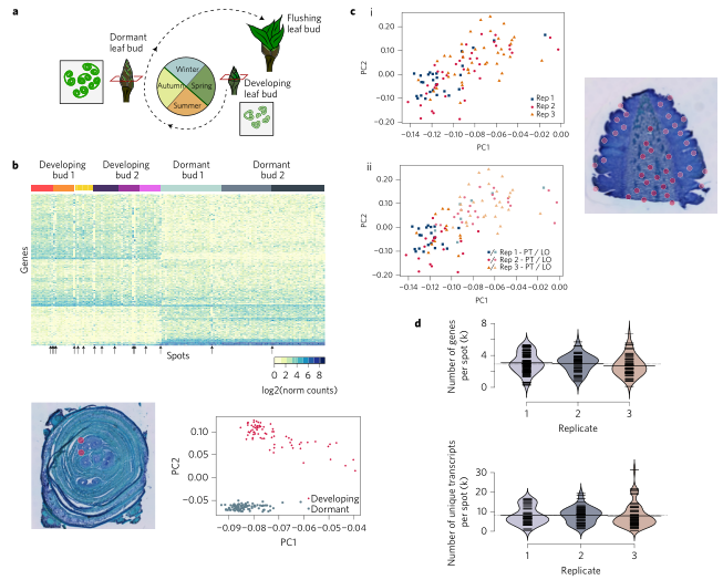 Stefania和 Joakim Lundeberg團隊在2017年就開發(fā)了植物上空間轉錄組技術,通過模型被子植物(擬南芥)和裸子植物(楊樹、挪威云杉)的微觀切片生成空間轉錄組譜來證明該技術的可行性。該技術捕獲區(qū)域為6.2*6.6mm2,含有1007spot,每個spot的直徑距離是100μm,可以檢測到植物組織在空間維度的所有RNA分子的表達。