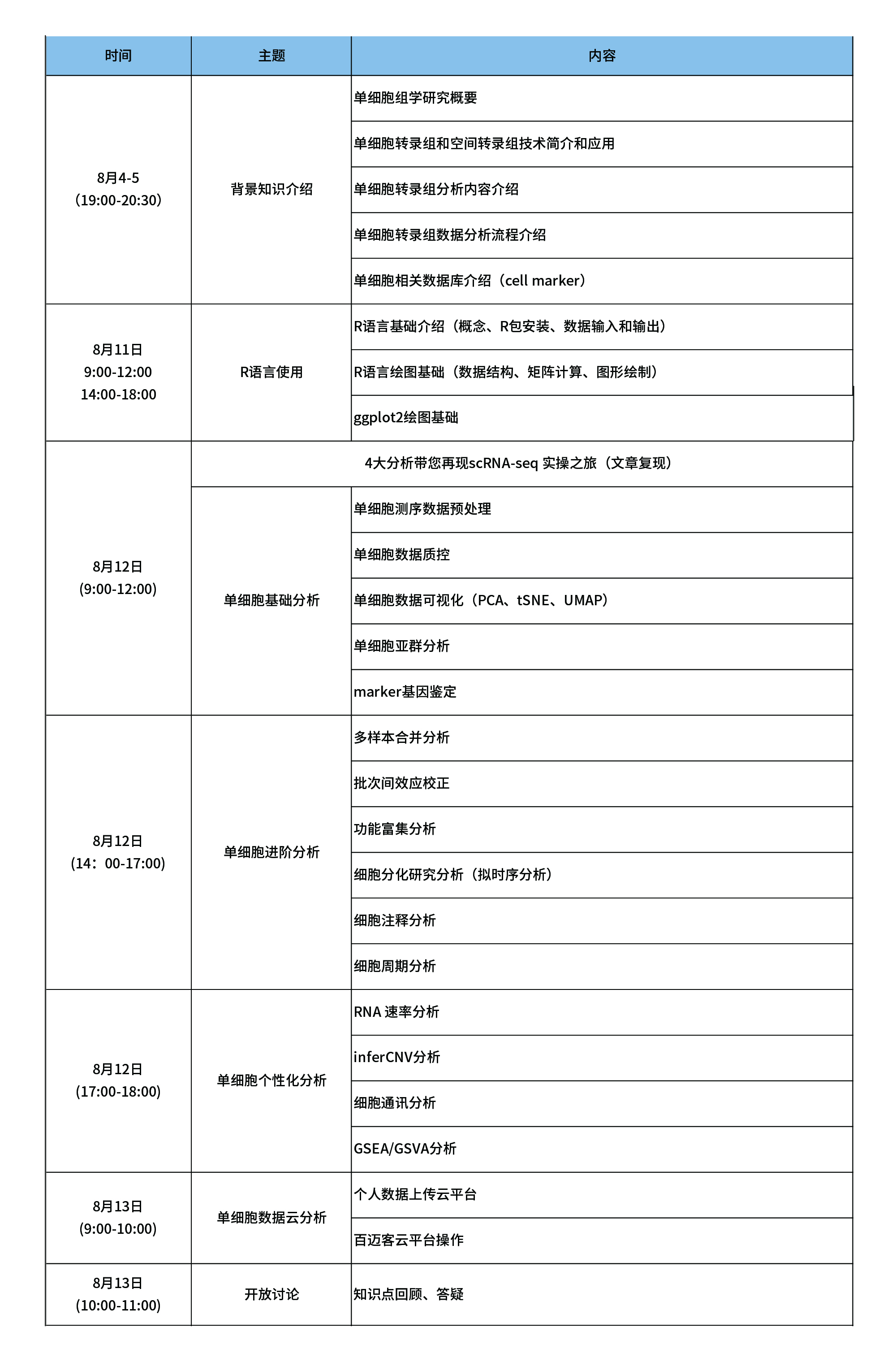 細(xì)胞和空間組學(xué)技術(shù)的快速發(fā)展正在開(kāi)啟生命科學(xué)的時(shí)空多維新時(shí)代,為復(fù)雜疾病的細(xì)胞異質(zhì)性研究提供新視角,引領(lǐng)了生物學(xué)從“時(shí)間”維度走向“空間”維度,廣泛應(yīng)用于動(dòng)植物生長(zhǎng)發(fā)育、腫瘤精準(zhǔn)治療研究等方向。為了促進(jìn)單細(xì)胞數(shù)據(jù)挖掘和分析,百邁客特開(kāi)展的單細(xì)胞數(shù)據(jù)分析課程,將為您呈現(xiàn)細(xì)胞分群、細(xì)胞分化研究、marker基因鑒定等分析內(nèi)容,幫助研究者實(shí)現(xiàn)了單細(xì)胞數(shù)據(jù)更快、更準(zhǔn)、更高的分析轉(zhuǎn)化。