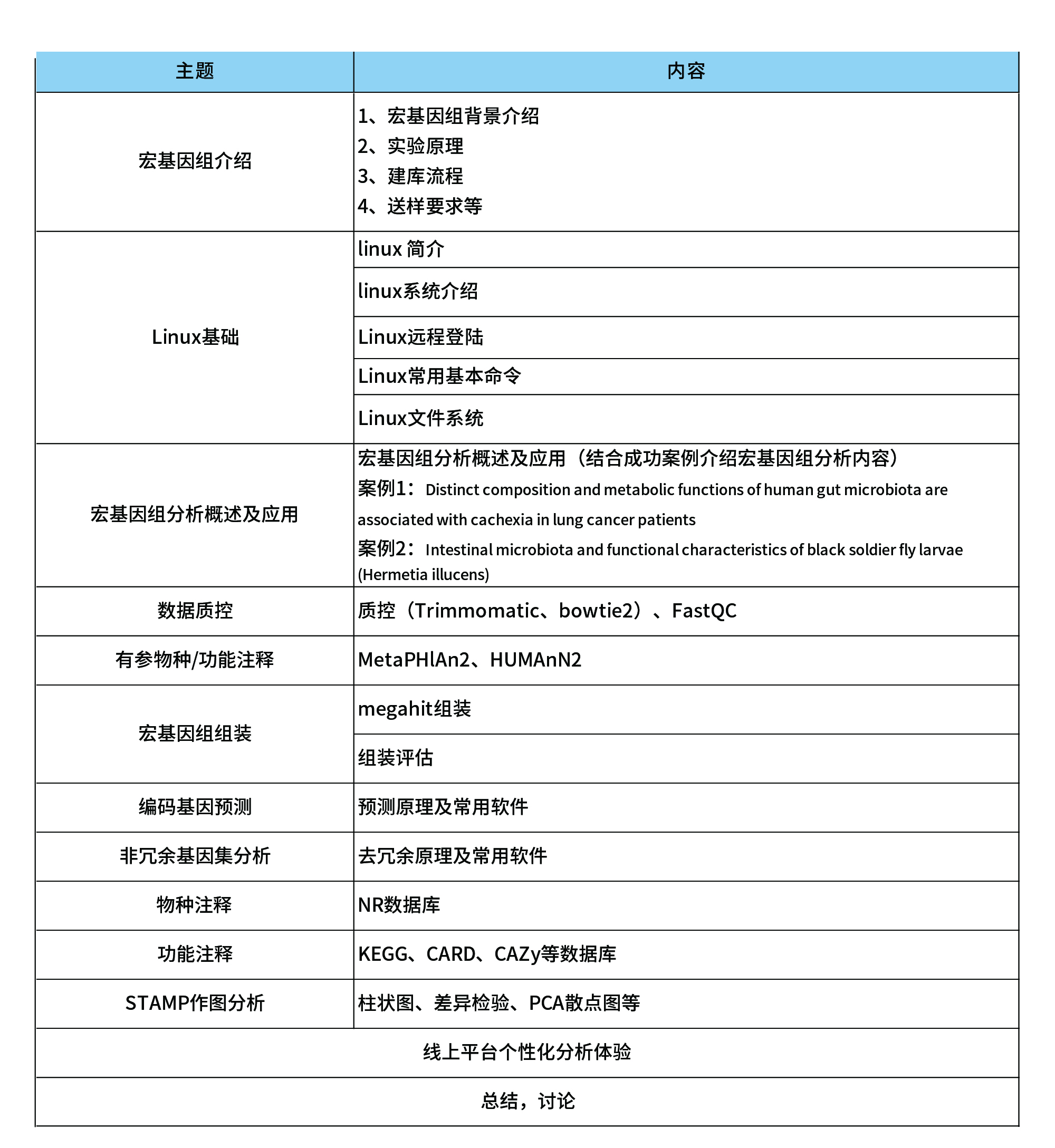 本課程從IF = 10及4分的SCI文章入手,從宏基因組背景介紹、實(shí)驗(yàn)(實(shí)驗(yàn)測(cè)序原理、建庫(kù)方法和流程、送樣注意事項(xiàng)等)、分析(下機(jī)數(shù)據(jù)質(zhì)控、有參注釋、無(wú)參組裝/預(yù)測(cè)/物種注釋/功能注釋等)、可視化作圖,讓您全面了解宏基因組分析每個(gè)過(guò)程,并結(jié)合案例文章,讓您了解宏基因組文章思路,助力科學(xué)研究。