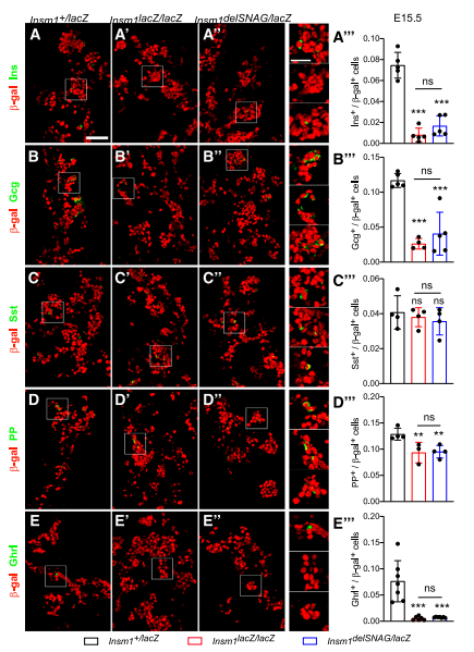 通過β-gal(lacZ等位基因的表達(dá))染色,觀察到Insm1delSNAG突變體的胰腺在E18.5時胰島素陽性β細(xì)胞數(shù)量減少,但是沒有像Insm1 null突變小鼠中那么嚴(yán)重(圖1A–A”’)。與對照相比,在Insm1delSNAG或Insm1中沒有觀察到α細(xì)胞數(shù)有變化(圖1B)。同時發(fā)現(xiàn)和對照相比,在Insm1delSNAG和Insm1-null突變體中觀察到PP數(shù)量的增加和δ細(xì)胞的減少(圖1D和E)。然而與對照小鼠相比,Insm1delSNAG突變體中生長抑素陽性的δ細(xì)胞數(shù)量顯著增加,且在Insm1-null突變體中細(xì)胞數(shù)減少了(圖1C–C”)。