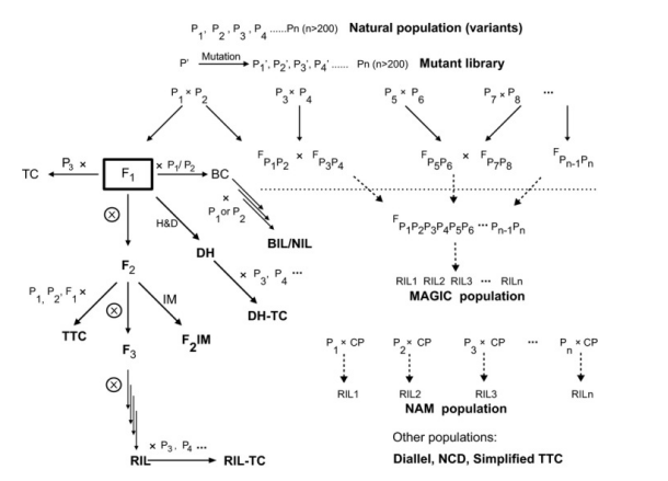 對(duì)于動(dòng)植物群體,通常利用性狀具有顯著差異的兩個(gè)親本進(jìn)行雜交,再通過自交、回交或者其他方式來構(gòu)建家系群體。家系群體按照遺傳穩(wěn)定性劃分可分為暫時(shí)性分離群體和永久性分離群體;如F1、F2、F3、BC等,這類群體中分離單位是個(gè)體,一經(jīng)自交或近交,其遺傳組成就會(huì)發(fā)生變化,無法永久使用,所以屬于暫時(shí)性分離群體;如RIL、DH等,這類群體中分離單位是株系(或者叫株行),不同株系間存在基因型的差異,而株系內(nèi)個(gè)體間的基因型是相同且純合的,自交不分離。這類群體通過自交或近交繁殖后,遺傳組成不會(huì)改變,可永久使用,所以屬于永久性分離群體。