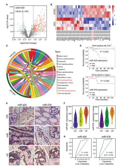 為了驗(yàn)證這兩種miRNA的差異表達(dá),作者收集了157例CRC患者癌組織及癌旁組織。TMA和ISH試驗(yàn)顯示,與對(duì)照相比miR-425和miR-576在CRC患者中高表達(dá)尤其是肝轉(zhuǎn)移患者(圖1E和F)。ROC曲線計(jì)算miR-425和miR-576基于肝轉(zhuǎn)移及其他相關(guān)危險(xiǎn)因素線下面積,初步確定其在CRLM中的可信診斷能力(圖1G)。