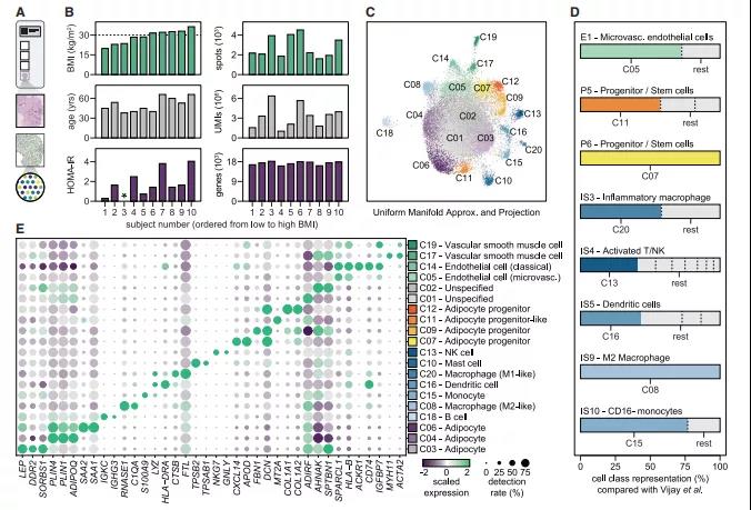作者使用10x Genomics Visium平臺對?WAT中的細(xì)胞類型的異質(zhì)性和空間位置進(jìn)行了研究。通過穿刺活檢獲得體重指數(shù)、年齡和對胰島素敏感性均有差異的10個人的腹部皮下WAT樣本。對其覆蓋27,937個spots的數(shù)據(jù)進(jìn)行空間轉(zhuǎn)錄組分析,結(jié)果發(fā)現(xiàn)每個切片平均檢測17,303個獨(dú)特基因和3,280,607個UMIs(圖1B)。通過對數(shù)據(jù)進(jìn)一步分析,共鑒定了?20種不同的細(xì)胞類群(C01-C20;圖1C),且存在于所有捐助者中。接下來,將目前的結(jié)果與最近發(fā)表的人類WAT間質(zhì)血管的單細(xì)胞數(shù)據(jù)進(jìn)行整合分析?,結(jié)果表明,空間數(shù)據(jù)包含了內(nèi)皮細(xì)胞、免疫細(xì)胞和祖細(xì)胞的特定群體(圖1D)。人工注釋標(biāo)記基因協(xié)助作者對20類細(xì)胞類型進(jìn)行標(biāo)注(圖1E),主要包括免疫細(xì)胞(單核細(xì)胞[C15], Ml-like[C20]和 M2-like 巨噬細(xì)胞[C08],樹突細(xì)胞[C16],肥大細(xì)胞[C10], B細(xì)胞[C18]和NK細(xì)胞[C13]),血管細(xì)胞(微血管 [C05]和經(jīng)典[C14]內(nèi)皮細(xì)胞和血管平滑肌細(xì)胞[C17 / C19])和脂肪細(xì)胞祖細(xì)胞(C07 / C09 / C12)。在后者中,C07表達(dá)成熟的前脂肪細(xì)胞/脂肪干細(xì)胞標(biāo)記物,C09表達(dá)編碼纖維化和細(xì)胞外基質(zhì)蛋白的轉(zhuǎn)錄本,而C12是前兩者的混合。一個祖細(xì)胞類群(C11)富集了多個編碼金屬硫蛋白的基因,在立體分析中將其歸為祖細(xì)胞(圖1D)。然而,在UMAP中,它從其他三個祖細(xì)胞中分離出來,因此,作者確定了其特征基因在脂肪生成的整體轉(zhuǎn)錄譜和WAT的不同組分中的表達(dá)。這些分析證實(shí)了C11在脂肪祖細(xì)胞中富集,并在人類脂肪形成過程中瞬時表達(dá)。