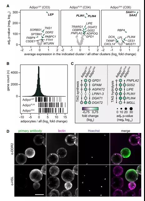 ? ? ? ? ? ?作者的分析確定了三種不同類型的成熟脂肪細(xì)胞,它們具有不同的轉(zhuǎn)錄譜和空間排列。作者進(jìn)一步定義了每個亞型的標(biāo)記基因(圖4A),結(jié)果發(fā)現(xiàn)了LEP(編碼脂肪因子瘦素)、PLIN1/PLIN4(編碼脂滴蛋白perilipin-1和-4)和SAA1/SAA2(編碼血清淀粉樣蛋白A1和A2急性期蛋白質(zhì))是各分類中最獨(dú)特的基因。因此,作者將這些亞群體命名為Adipo LEP、Adipo PLIN和Adipo SAA。如結(jié)果所示,Adipo LEP富集了細(xì)胞-細(xì)胞/基質(zhì)細(xì)胞相互作用蛋白和瘦素信號/分泌調(diào)節(jié)基因。AdipoPLIN標(biāo)記基因與葡萄糖和脂質(zhì)代謝以及脂肪因子脂聯(lián)素相關(guān)。雖然Adipo SAA與Adipo PLIN有一些共同的標(biāo)記基因,但這類基因也富集了多種與視黃醇代謝及結(jié)合的多種脂肪因子和酶。為了證實(shí)這三種亞型的標(biāo)記基因在成熟脂肪細(xì)胞中表達(dá),作者分析了大量配對樣本的轉(zhuǎn)錄組學(xué)數(shù)據(jù),比較了從WAT中分離的脂肪細(xì)胞和非脂肪細(xì)胞。相關(guān)數(shù)據(jù)表明,50個標(biāo)記基因在脂肪細(xì)胞中富集(圖4B),說明Adipo LEP、AdipPLIN和AdipoSAA代表不同類型的脂肪細(xì)胞??臻g數(shù)據(jù)的進(jìn)一步分析顯示,這些亞型表現(xiàn)出相互的表達(dá)模式(圖4C)。作者用針對AdipoLEP(DDR2)和Adipo PLIN (HSL,由LIPE編碼)標(biāo)記蛋白的抗體對從人皮下WAT分離的成熟脂肪細(xì)胞進(jìn)行染色,驗(yàn)證了該結(jié)果(圖4D)。此外,還使用針對CD36(Adipo PLIN的標(biāo)記物)和 CSDEl(Adipo LEP的標(biāo)記物)的抗體對人類成熟脂肪細(xì)胞進(jìn)行了免疫共標(biāo)記,觀察到其相互的染色模式。對于Adipo SAA,作者進(jìn)行了多種抗體的測試,但沒有一種抗體顯示出足夠的特異性。綜上所述,空間數(shù)據(jù)可在蛋白質(zhì)水平上進(jìn)行概述,并支持所鑒定的脂肪細(xì)胞具有不同表達(dá)譜的亞群。