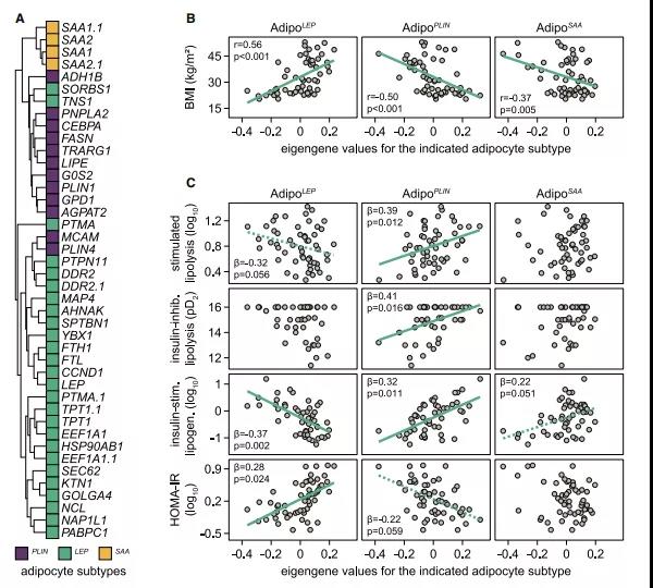 ? ? ? ??接下來,作者的目標(biāo)是了解脂肪細(xì)胞亞型對組織功能的貢獻(xiàn)。為深入了解脂肪細(xì)胞亞型方面的功能,作者對56女性的WAT轉(zhuǎn)錄組數(shù)據(jù)進(jìn)行了綜合分析,其中還對新鮮分離的脂肪細(xì)胞進(jìn)行了脂肪分解/脂肪生成測量。在比較56名女性數(shù)據(jù)時,Adipo PLIN、Adipo LEP和Adipo SAA標(biāo)記基因形成了單獨(dú)的、共同調(diào)控的集群(圖6A),可用來確定細(xì)胞類型豐度和脂肪細(xì)胞表型之間的關(guān)系。與空間數(shù)據(jù)一致 ,Adipo PLIN在肥胖人群中的比例降低,分析顯示Adipo PLIN與BMI之間負(fù)相關(guān),AdipoSAA與BMI也呈負(fù)相關(guān),而AdipoLEP呈正相關(guān)(圖6B)。