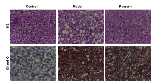 如圖1A-C所示,4周MCD喂養(yǎng)小鼠后,小鼠體重和肝臟體重顯著下降。葛根素治療可顯著減輕體重?fù)p失,但對(duì)肝臟重量沒(méi)有影響。但3個(gè)試驗(yàn)組的肝/體質(zhì)量比無(wú)顯著差異。ALT和AST通常用于評(píng)估肝細(xì)胞損傷。與對(duì)照組相比,NASH模型組血清ALT、AST活性顯著升高,TG、TC明顯降低。葛根素補(bǔ)充消除了血清中谷丙轉(zhuǎn)氨酶和谷草轉(zhuǎn)氨酶的升高,但對(duì)血清中TC和TG沒(méi)有影響(圖1D G)。在MCD飲食誘導(dǎo)的NASH小鼠中,觀察到肝臟TG含量顯著升高,而葛根素治療則阻止了這種積累。肝TC含量各組間無(wú)差異(圖1H I)。MCD飼料喂養(yǎng)的模型小鼠與正常小鼠相比,肝切片的H&E和 Oil Red O染色顯示,肝切片出現(xiàn)微泡和大泡性脂肪變性,并伴有炎癥細(xì)胞浸潤(rùn)和肝細(xì)胞球化。