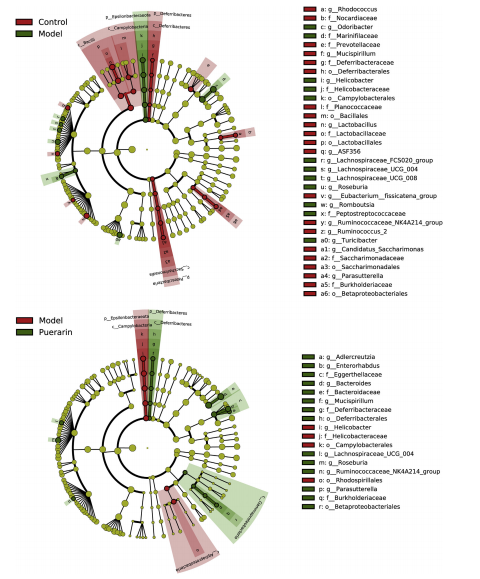 門水平的分類分析表明,厚壁菌門、擬桿菌門和放線菌門在所有類群的糞便微生物群落中占優(yōu)勢(shì)。與對(duì)照組相比,模型組的Epsilonbacteraeota水平較高,而葛根素處理可逆轉(zhuǎn)這一趨勢(shì)(圖7D)。采用LEfSe方法,篩選出LDA評(píng)分大于2.0的明顯改變的類群,以鑒定類群間(門到屬)的差異類群。如圖8和圖9所示,在對(duì)照組和模型組之間,模型和葛根素組之間,共發(fā)現(xiàn)了40和24個(gè)不同的細(xì)菌分類分支。有趣的是,在葛根素治療后,14種不同的細(xì)菌類群在NASH小鼠中顯示出相同的恢復(fù)正常水平的趨勢(shì),包括p Epsilonbacteraeota, c Campylobacteria、o彎曲菌目、 f 螺桿菌科、 g幽門螺桿菌屬、p 脫鐵桿菌門、c 脫鐵桿菌、 o 脫鐵桿菌、 f 脫鐵桿菌科、g Mucispirillum、o Betaproteobacteriales、f burkholderaceae、g Parasutterella 和g瘤胃球菌科NK4A214組。值得一提的是,模型小鼠中氏菌屬的成員比對(duì)照組小鼠大,葛根素治療后進(jìn)一步擴(kuò)大。(字母 p、c、o、f 和 g 分別代表門、綱、目、科和屬)