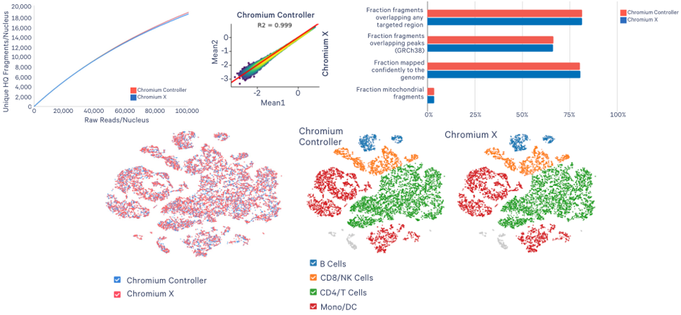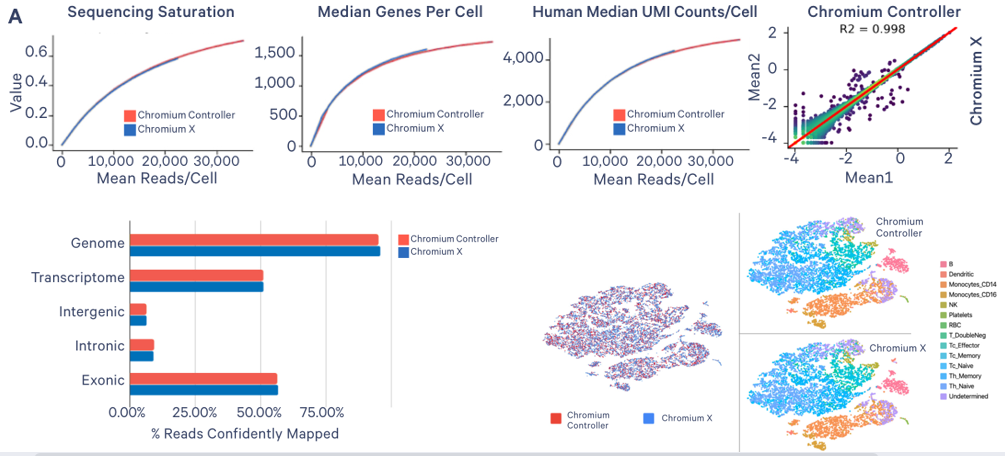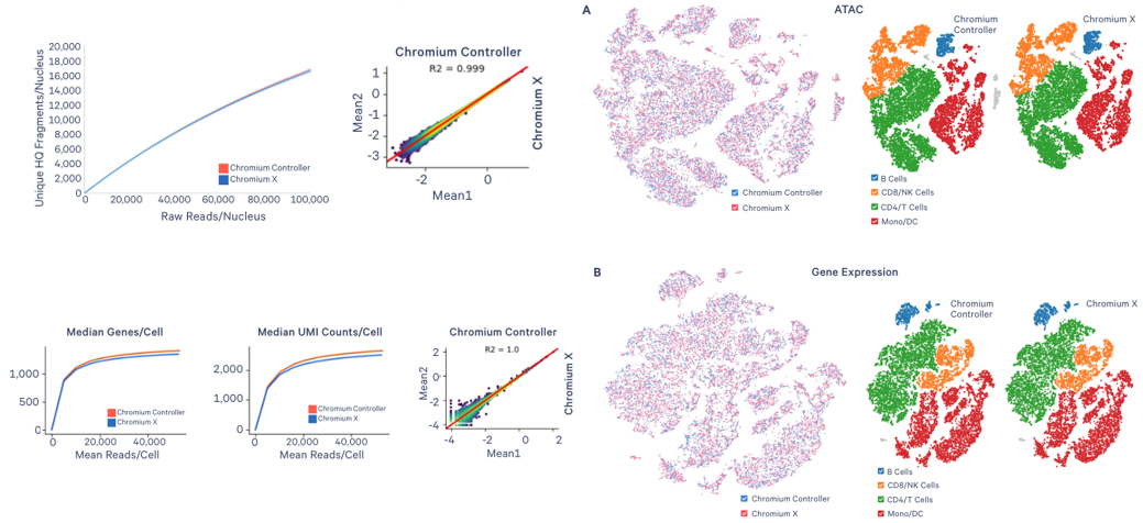單細(xì)胞Chromium X系統(tǒng)可兼容單細(xì)胞系列產(chǎn)品,且與Controller系統(tǒng)數(shù)據(jù)保持極強的相關(guān)性。以下分別展示利用PBMCs捕獲10000個細(xì)胞/細(xì)胞核Chromium X和Controller系統(tǒng)的數(shù)據(jù)分析比較: