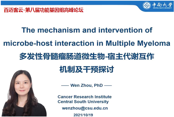 中南大學(xué)腫瘤研究所周文研究員的報(bào)告題目是“多發(fā)性骨髓瘤腸道微生物-宿主代謝互作機(jī)制及干預(yù)”,周老師首先介紹了多發(fā)性骨髓瘤(Multiple Myeloma, MM)的特點(diǎn),隨后介紹了課題組利用宏基因組測序技術(shù)得到的發(fā)現(xiàn),MM患者腸道微生物生態(tài)紊亂,并出現(xiàn)氮源微生物的優(yōu)勢生長,腸道微生物-宿主代謝兩者互作從而加速宿主MM的腫瘤進(jìn)程。通過干預(yù)MM患者腸道菌群和氮源攝入可作為MM治療的新靶標(biāo)。