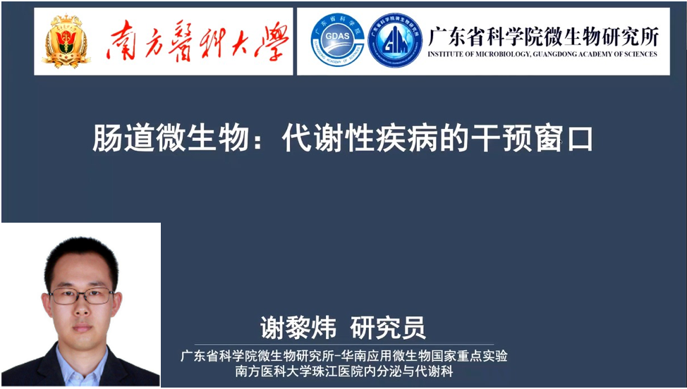 廣東省微生物研究所謝黎煒研究員講解了“腸道微生物:代謝性疾病的干預(yù)窗口”謝老師首先介紹了腸道菌群是多因素誘發(fā)肥胖癥的承載體,代謝性疾病,例如:2型糖尿病,肥胖和代謝性肝病等,嚴(yán)重?fù)p害身體健康,甚至致殘致死。研究發(fā)現(xiàn)代謝性疾病的發(fā)生和發(fā)展伴隨腸道微生物多樣性、種類和功能的變化,謝老師團(tuán)隊(duì)近期開展的短期理床低碳減重研究和益生菌代謝產(chǎn)物緩解機(jī)體糖脂代謝的研究為代謝性疾病的腸道干預(yù)提供了有力的證據(jù)。