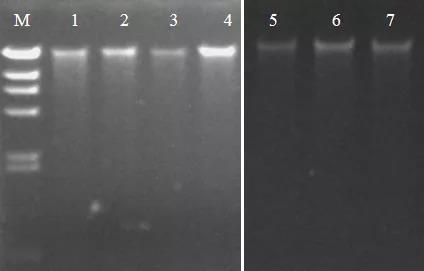 圖3:DNA的凝膠電泳圖。將提取的DNA進(jìn)行1%瓊脂糖凝膠電泳跑膠。其中M: λ-Hind Ⅲ DNA Marker;Lane 1:芝麻/種子 ;Lane 2:堇菜/葉片;Lane 3:水稻/種子;Lane 4:油莎豆/葉片;Lane 5:馬鈴薯/塊莖;Lane 6:沙棘/果實 ;Lane 7:煙草/葉片 。