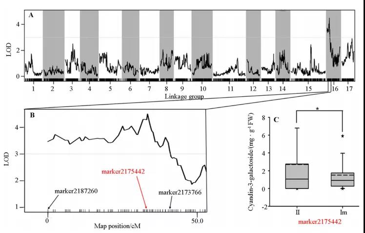采用Kruskal-Wallis檢驗(yàn)對(duì)矢車菊素半乳糖苷濃度進(jìn)行QTL分析,采用區(qū)間作圖(IM)和多QTL模型(MQM)檢測潛在的QTL,閾值LOD為3.0。結(jié)果顯示,只在‘Red3’的LG16位點(diǎn)的頂端檢測到一個(gè)LOD值為4.49的QTL,該QTL的區(qū)間范圍為0 ~ 40.79 cM,解釋表型變異率為14.4%。此外,該QTL兩側(cè)有兩個(gè)標(biāo)記,分別是marker2187260 ~ marker2173766,作者進(jìn)一步調(diào)查了不同株型之間的表型差異,結(jié)果表明,最接近QTL峰的標(biāo)記之一mark2175442將分離群體分為純合子ll型和雜合子lm型兩類。純合子ll型表現(xiàn)出明顯高于雜合子lm 型的矢車菊素半乳糖苷濃度。結(jié)合前人的研究,該研究結(jié)果表明,LG16頂部的QTL熱點(diǎn)區(qū)域可能在控制蘋果紅肉著色中發(fā)揮潛在的作用。