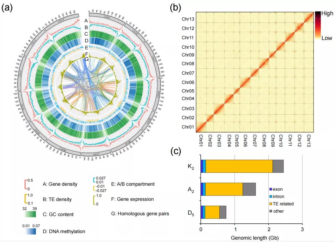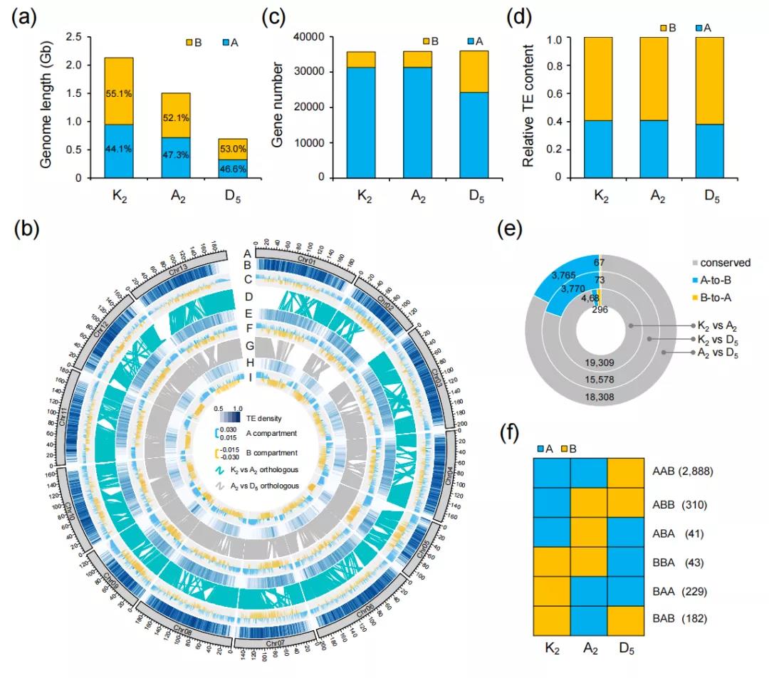 植物染色質(zhì)被劃分為“活性”(A)或“非活性”(B)區(qū)域,通常分別對(duì)應(yīng)于常染色質(zhì)和異染色質(zhì)。HiC染色質(zhì)互作分析發(fā)現(xiàn),與基因組大小的差異一致,與A2或D5相比,K2基因組的活躍區(qū)域(約占基因組的44%)較少,而非活躍區(qū)域(55%)較多。較大的K2和A2基因組在A/B compartment之間表現(xiàn)出更多的插入,與這些較大基因組中發(fā)現(xiàn)的富含TE的區(qū)域相對(duì)應(yīng)。A2/K2與D5相比多了約7000個(gè)基因,這與活躍的轉(zhuǎn)座子擴(kuò)增相關(guān)。對(duì)于較大的基因組,一個(gè)compartment中TEs的比例也稍大,表明這些較大基因組(K2和A2)所顯示的A/B compartment變化模式導(dǎo)致更擴(kuò)散的邊界,并在A compartment中包含更多的基因和TEs。