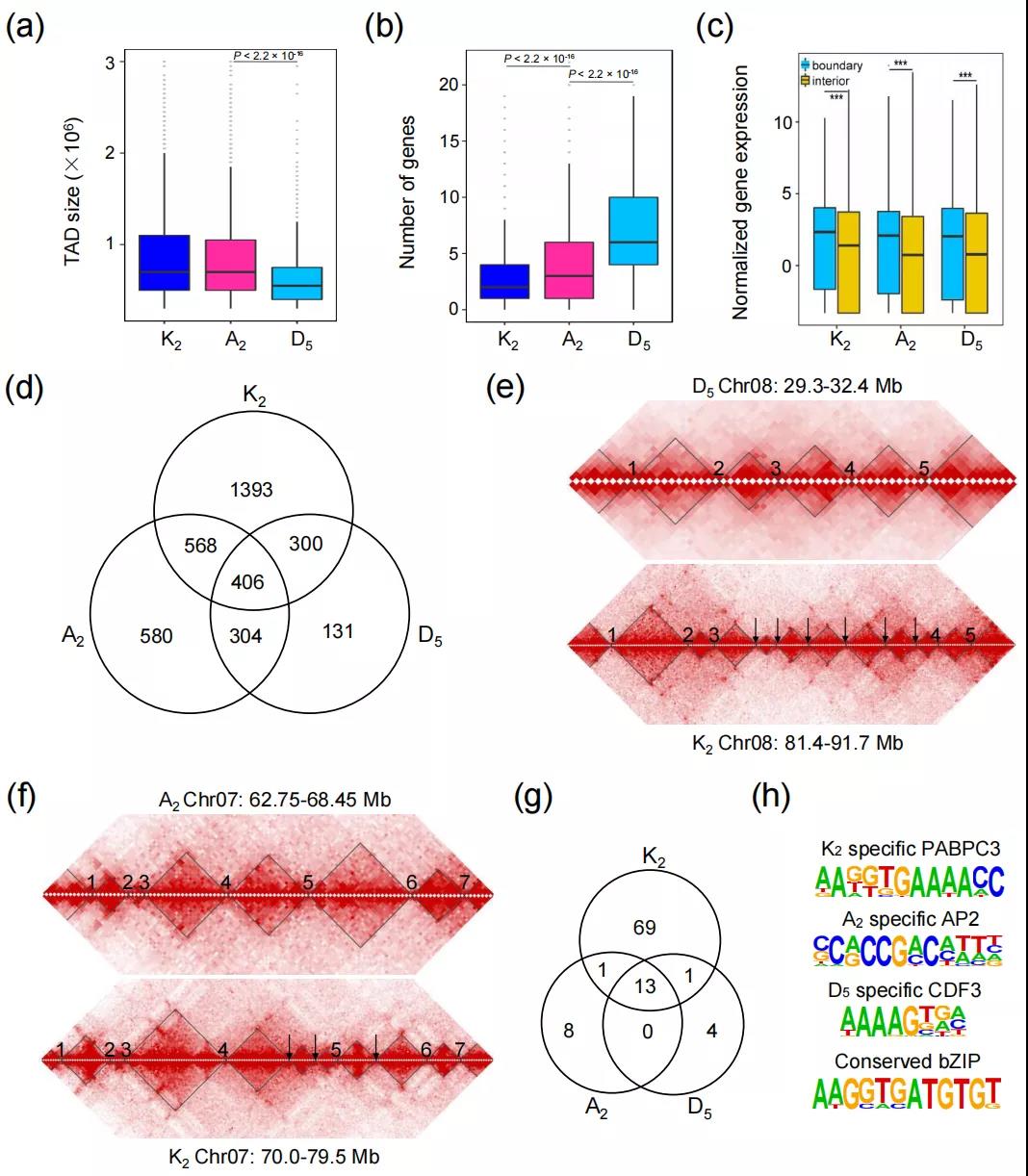 拓?fù)浣Y(jié)構(gòu)域(TAD)是位于A/B compartment內(nèi)的較小域,表現(xiàn)出頻繁的域內(nèi)相互作用,與位于域外的位點(diǎn)的相互作用頻率較低。由于TAD邊界的轉(zhuǎn)換可以指示結(jié)構(gòu)重組,作者比較了共線區(qū)中的TAD邊界,以探索三個(gè)基因組中的TAD保護(hù)和轉(zhuǎn)換。研究發(fā)現(xiàn),在三個(gè)基因組中,K2中有406個(gè)TAD邊界是保守的,并且隨著TAD總數(shù)的增加,譜系特異性邊界的數(shù)量增加。K2基因組在TAD邊界的基因數(shù)最少,而D5的基因數(shù)最多(圖5)。大約60%的拓?fù)浣Y(jié)構(gòu)域(TAD)在三個(gè)基因組中發(fā)生了重新組織,K2基因組中有更多特異的TAD。TAD邊界處的motif分析顯示69個(gè)特定于K2的motif,但A2和D5中分別只有8個(gè)和4個(gè)特定motif。