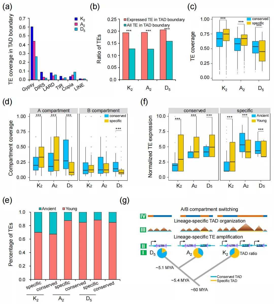 基于邊界TE覆蓋度,邊界TE表達(dá)以及TE插入時(shí)間分析,發(fā)現(xiàn)K2不保守的TAD邊界存在特異的和較新的轉(zhuǎn)座子(物種分化后爆發(fā)的TE)插入。這些結(jié)果表明最近在K2和A2基因組中表達(dá)的TEs的擴(kuò)增可能有助于在三個(gè)物種分化后形成譜系特異性TAD邊界?;谶@些結(jié)果,作者提出了三個(gè)棉種分化過(guò)程中,基因組擴(kuò)張-轉(zhuǎn)座子擴(kuò)增介導(dǎo)的A/B compartment轉(zhuǎn)換和TAD重組的進(jìn)化模型(圖6)。