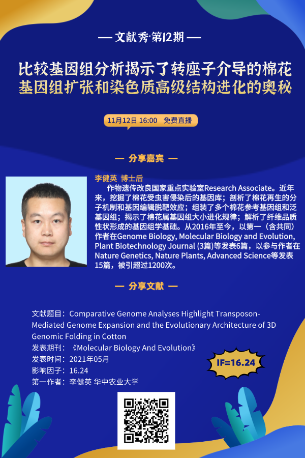 為了更好的分享熱門科研進(jìn)展與研究經(jīng)歷,助力科研解讀基因,百邁客特邀李健英博士,于11月12日以直播的形式,為我們分享棉花轉(zhuǎn)座子與基因組三維結(jié)構(gòu)進(jìn)化的奧秘(掃描圖中二維碼即可免費(fèi)報(bào)名參與)。