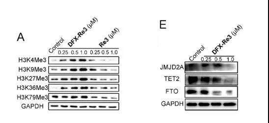 通過免疫印跡實(shí)驗(yàn)發(fā)現(xiàn)DFX-Re3處理后抑制甲基化組蛋白H3、JMJD2A、TET2、FTO等甲基化修飾酶的表達(dá)。細(xì)胞質(zhì)中鐵含量的降低,同時(shí)這些結(jié)果表明,鐵在細(xì)胞內(nèi)轉(zhuǎn)移到線粒體可以增加DNA、RNA和組蛋白甲基化水平。