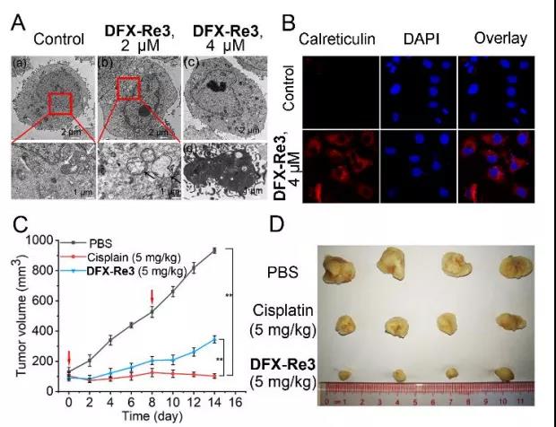 在體內(nèi)和體外評估了DFX-Re3的抗癌機(jī)制。透射電鏡觀察顯示,DFX-Re3 (2 M, 24 h)處理后線粒體明顯膨脹,提示MMP缺失。濃度較高時(shí),細(xì)胞核邊緣和中心出現(xiàn)染色質(zhì)凝聚,細(xì)胞核碎裂,提示晚期凋亡。Annexin V/碘化丙啶(PI)雙染色顯示,在DFX-Re3處理的樣品中,凋亡早期和晚期細(xì)胞比例呈劑量依賴性增加(圖S36)。DFX-Re3激活caspase 3/7, Z-VAD-FMK(泛caspase抑制劑)預(yù)處理可抑制細(xì)胞死亡率。與之前的RNA-seq結(jié)果一致,DFX-Re3可以誘導(dǎo)多種免疫相關(guān)基因的表達(dá)改變,DFX-Re3誘導(dǎo)免疫相關(guān)基因表達(dá)改變。誘導(dǎo)鈣網(wǎng)蛋白調(diào)控,這是免疫原性死亡的重要分子標(biāo)記。這些結(jié)果表明,DFX- Re3可誘導(dǎo)caspase依賴的免疫原性凋亡。體內(nèi)抗腫瘤實(shí)驗(yàn)中,DFX-Re3未見小鼠死亡或體重明顯減輕,治療結(jié)束時(shí),DFX-Re3未見臟器明顯病理改變。這些數(shù)據(jù)表明,DFX-Re3在體內(nèi)具有高的抗癌作用和低的全身毒性。