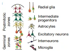 圖1:發(fā)育中皮質(zhì)的橫截面示意圖,顯示了主要細(xì)胞類(lèi)型。