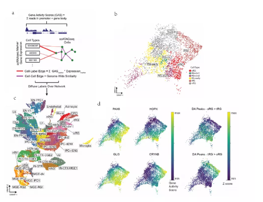 使用基因活性分?jǐn)?shù)來(lái)區(qū)分細(xì)胞類(lèi)型,鑒定了多種主要的細(xì)胞類(lèi)型,包括放射狀膠質(zhì)細(xì)胞(RGS)、中間前體細(xì)胞(IPC)、深層(皮質(zhì)V-VI層)興奮性神經(jīng)元(dlENs)、上層(皮質(zhì)II-IV層)興奮性神經(jīng)元(UlENs)、MGE和CGE來(lái)源的皮質(zhì)中間神經(jīng)元(分別為IN-MGES和IN-CGES)、胰島神經(jīng)元、MGE的前體細(xì)胞、小神經(jīng)膠質(zhì)細(xì)胞、少突膠質(zhì)前體細(xì)胞(OPCs)、內(nèi)皮細(xì)胞以及壁細(xì)胞。此外,結(jié)合scRNA-seq數(shù)據(jù),使用CellWalker將scATAC-seq細(xì)胞與細(xì)胞類(lèi)型匹配。CellWalker以更精細(xì)的分辨率識(shí)別細(xì)胞類(lèi)型和更廣泛的細(xì)胞亞型。此外,作者可以在兩種亞型(TRGS和ORGS)之間識(shí)別出不同的開(kāi)放區(qū),這兩種亞型分別表達(dá)CRYAB和HOPX,這表明scATAC-seq能夠在高分辨率下區(qū)分細(xì)胞亞型,具有更高的靈敏度。