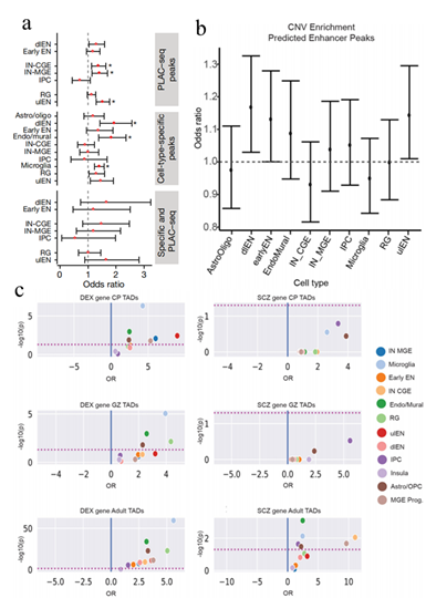 不同發(fā)育階段和分化狀態(tài)的染色質(zhì)狀態(tài)的細(xì)胞分辨率數(shù)據(jù)可能提供突變和發(fā)育中的不同細(xì)胞類(lèi)型選擇性脆弱性之間的聯(lián)系。為此,研究者將特定細(xì)胞類(lèi)型的ATAC-seq peaks和預(yù)測(cè)的增強(qiáng)子與疾病相關(guān)的常見(jiàn)和罕見(jiàn)的非編碼突變體記性關(guān)聯(lián)分析。首先分析了細(xì)胞類(lèi)型特異性的peaks sets、預(yù)測(cè)的增強(qiáng)子、啟動(dòng)子相互作用區(qū)域與基因組區(qū)域重疊的peaks值,這些區(qū)域在發(fā)育遲緩的個(gè)體中富集了拷貝數(shù)變異;結(jié)果發(fā)現(xiàn)dlEN、內(nèi)皮/壁層和小神經(jīng)膠質(zhì)細(xì)胞特異性peaks顯著富集,以及中間神經(jīng)元中重疊啟動(dòng)子相互作用區(qū)的peaks顯著富集。