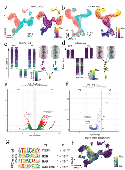 在神經(jīng)發(fā)生的早期,出現(xiàn)了特定區(qū)域類(lèi)型的皮質(zhì)興奮性神經(jīng)元,但在不同區(qū)域的前體細(xì)胞之間只發(fā)現(xiàn)了有限的轉(zhuǎn)錄差異。調(diào)控元件的可及性變化通常先于基因表達(dá)。研究者比較了頭-尾軸兩端、PFC和V1的興奮性譜系細(xì)胞的scRNA-seq和scATAC-seq圖譜。在每種模式中,對(duì)細(xì)胞進(jìn)行擬時(shí)間分析,確定分化軌跡,并沿著該軌跡確定PFC和V1譜系之間轉(zhuǎn)錄或染色質(zhì)狀態(tài)差異變得明顯的“分支點(diǎn)”。與轉(zhuǎn)錄組數(shù)據(jù)揭示了興奮性神經(jīng)元的區(qū)域特異性分群不同的是,染色質(zhì)狀態(tài)特征表明PFC和V1中間前體細(xì)胞群體之間存在顯著差異。在轉(zhuǎn)錄水平上,PFC和V1IPCs只有少數(shù)幾個(gè)基因有差異表達(dá),而染色質(zhì)可及性分析發(fā)現(xiàn)這些細(xì)胞類(lèi)型之間有1800多個(gè)差異可及區(qū)。