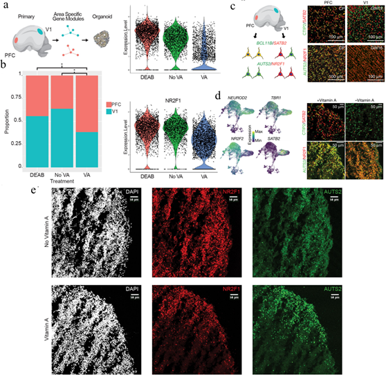 在哺乳動(dòng)物大腦發(fā)育的過(guò)程中,視黃酸信號(hào)在神經(jīng)組織中發(fā)揮著重要的作用。為了測(cè)試RA是否促進(jìn)人類(lèi)PFC的分化,在含有或不含有維生素A(RA合成的前體)的情況下培養(yǎng)皮質(zhì)類(lèi)器官。同時(shí)利用DEAB(一種有效的RA合成抑制劑)處理與維生素A一起培養(yǎng)的腦類(lèi)器官。在分化的第10周,此時(shí)深層神經(jīng)正在發(fā)生,利用scRNA-seq分析了腦類(lèi)器官。發(fā)現(xiàn)在維生素A存在下培養(yǎng)的興奮性前腦神經(jīng)元與不含維生素A或在DEAB存在下培養(yǎng)的腦類(lèi)器官的神經(jīng)元是分開(kāi)聚類(lèi)的。還發(fā)現(xiàn)了區(qū)分PFC和V1皮層神經(jīng)元的信號(hào)。利用目前的分類(lèi)方法注釋類(lèi)器官神經(jīng)元中的PFC和V1神經(jīng)元的特征;與未使用維生素A培養(yǎng)或使用DEAB處理的神經(jīng)元相比,維生素A培養(yǎng)的類(lèi)器官中PFC類(lèi)似神經(jīng)元的比例始終較高。免疫染色證實(shí)了基因產(chǎn)物的差異表達(dá),并發(fā)現(xiàn)與含有維生素A培養(yǎng)的腦類(lèi)器官的PFC特性一致。這些發(fā)現(xiàn)表明,RA信號(hào)通路有助于人類(lèi)皮質(zhì)發(fā)育過(guò)程中PFC神經(jīng)元譜系的發(fā)育。