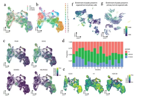 圖9:腦類(lèi)器官和原代組織的peaks比較揭示染色質(zhì)圖譜的顯著差異