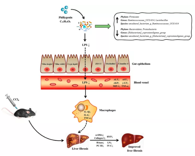 連翹素(PHI)具有良好的保肝作用,通過TLR4/MyD88/NF-κB信號(hào)通路抑制脂多糖誘導(dǎo)的促炎反應(yīng)和LX2細(xì)胞的激活,從而緩解肝纖維化。此外,鑒于腸道菌群在肝纖維化發(fā)展過程中的重要作用,PHI的抗纖維化作用是否部分依賴于腸道菌群失調(diào)的調(diào)節(jié)尚不清楚。