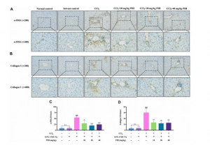 觀察纖維組織分布、Masson染色及Sirius red染色。如圖3A和B所示,Masson染色時(shí)膠原纖維呈藍(lán)色,Sirius red染色時(shí)呈紅色。結(jié)果表明,正常對(duì)照組和溶劑對(duì)照組幾乎不產(chǎn)生膠原纖維,而CCl4可誘導(dǎo)產(chǎn)生大量的膠原纖維。有趣的是,PHI處理顯著減少了肝臟中膠原的積累。