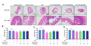 此外,作者測(cè)量了各組小鼠回腸絨毛高度、寬度和隱窩深度,結(jié)果如圖6B-D所示。正常對(duì)照組與溶劑對(duì)照組無明顯差異。與溶劑對(duì)照組相比,CCl4組回腸絨毛高度、寬度和隱窩深度顯著減少。PHI(20和40mg/kg)處理后上述指標(biāo)減少均可逆轉(zhuǎn)。綜上所述PHI可以顯著改善腸道損傷。