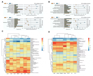 作者通過KEGG和COG數(shù)據(jù)庫預(yù)測(cè)了微生物的功能(圖9A和B)。CCl4處理組富集的通路為energy production and conversion、membrane transport和signal transduction mechanisms。肝纖維化小鼠PHI處理后,微生物富集的通路為carbohydrate transport and metabolism、lipid transport and