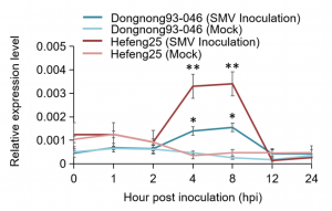 作者進一步通過表達分析、遺傳轉化分析等方法驗證GmST1基因對大豆花葉病毒的抗性,通過qRT-PCR和RNA-seq對SMV抗性株系Dongnong93-046和SMV-感性株系Hefeng25的不同組織進行分析,分析結果表明,GmST1基因受SMV感染調控,且該基因在抗SMV和易感SMV大豆品種之間存在差異表達。通過轉基因過表達遺傳轉化實驗發(fā)現,GmST1的RSVG2-R等位基因提升了大豆對SMV G2和G3菌株的抗性。最終發(fā)現編碼磺基轉移酶的GmST1基因, 賦予大豆對大豆花葉病毒G2和G3株的抗性。