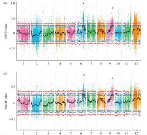 本研究在Longjiang25(耐冷)和Longjiang11(不耐冷)雜交構建的F2群體中(245份材料),挑選50個耐冷和50個不耐冷極端材料分別進行混池測序,親本各10×,子代分別是67×和80×,進行BSA分析;利用SNP index 和indel index方法進行性狀與標記的關聯,最終將候選區(qū)域定位到6號染色體和9號染色體上的0.82Mb區(qū)域內,分析發(fā)現這些區(qū)域共包含98個注釋基因。