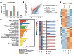 作者對低溫脅迫(12℃)條件下,對第0、2、4天水稻花序上3.5-4.5mm的幼穗進行取樣, 做 RNA-seq分析 ,分析兩親本在低溫脅迫條件下,差異基因表達情況。結合BSA關聯分析的定位區(qū)間,發(fā)現候選區(qū)域內有50個差異表達基因。通過對差異表達基因進行GO和KEGG富集功能分析結合功能富集分析,確定4個(Os09g0514200、Os09g0516500、Os09g0516600和Os09g0511600)潛在候選基因與耐寒性相關;進一步通過qRT-PCR驗證這4個基因的表達情況,結果顯示與轉錄組表達一致。