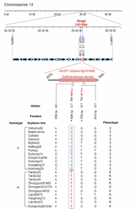 接著,作者又利用一個超大F2分離群體,在Rsvg2的間區(qū)和側翼區(qū),利用55個具有多態(tài)性的SSR標記與F2中抗性植株的表型數據進行關聯分析,將Rsvg2定位至2.83 kb區(qū)間內,該區(qū)間包含一個編碼SOT(磺基轉移酶)的GmST1基因。作者將GmST1確定為Rsvg2位點的候選基因。