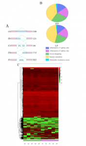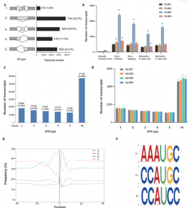 APA和AS的鑒定增強(qiáng)了我們對轉(zhuǎn)錄異構(gòu)體多樣性生物學(xué)作用的理解。在本研究中,確定了9035例AS事件,并將其分為五類(圖2)。在檢測到的全部轉(zhuǎn)錄本中,有6.86%由某種可變剪切形式產(chǎn)生,其中內(nèi)含子保留是最常見的可變剪切事件。此外,在88092個基因位點(diǎn)上進(jìn)一步確定了207955個APA事件。