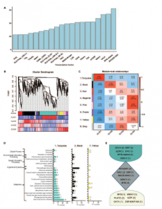 共鑒定出4251個TFs,屬于208個基因家族。其中最豐富的是AP2/ERF(176)、MYB相關(guān)(135)和bHLH(133)(圖4A),同時WGCNA分析也確定了與羅浮買麻藤莖發(fā)育高度相關(guān)的八個TFs模塊(圖4B、C)。綠松石色(編號1,315 TFs)、黑色(編號2,215 TFs)和黃色(編號7,75 TFs)最富集。綠松石色模塊中的TF主要在GLN01中表達(dá),而黑色和黃色模塊中的TF分別在GLN02和GLN04中密集表達(dá)(圖4B、C)。很明顯,綠松石色模塊中的TFs主要通過三種KEGG途徑富集,“淀粉和蔗糖代謝”(11 TFs,ko00500)、“淀粉和蔗糖代謝”(8 TFs,ko00500)和“戊糖和葡萄糖醛酸鹽相互轉(zhuǎn)化”(6 TFs,ko00040)(圖4D)。類似地,黑色模塊中的TFs主要富集于“植物-病原體相互作用”(6 TFs,ko04626)、“碳代謝”(4TFs)和“苯丙烷生物合成”(4 TFs,ko00940),而黃色模塊中的TFs主要富集于“氰基氨基酸代謝”(2 TFs,ko00460)和“糖酵解/糖異生”(2 TFs,ko00010)。此外,還發(fā)現(xiàn)綠松石色模塊中bHLH、GRF和MYB相關(guān)蛋白高度表達(dá);在黑色模塊中EGAP2/ERF、NAC和MYB高度表達(dá);在黃色模塊中MYB、bZIP和PLATZ高度表達(dá)(圖4E)。