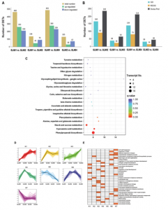 結(jié)果顯示GLN01和GLN04之間有492個DET,其中283個上調(diào),209個下調(diào)(圖5A)。接著是GLN01和GLN02,GLN01和GLN03,分別有468個和136個。富集分析結(jié)果顯示,GLN01和GLN04之間的DET在三條KEGG途徑:“苯丙烷生物合成”(16個DET)、“淀粉和蔗糖代謝”(10個DET)和“氰基氨基酸代謝”(8個DET)中顯著富集(圖5C)。