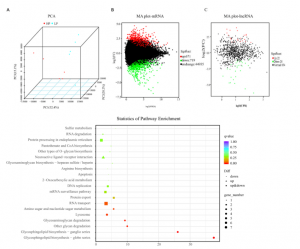 共鑒定出1390個mRNAs(671個上調(diào),719個下調(diào))和50個lncRNAs(22個上調(diào),28個下調(diào))(圖4B和C)。在本研究中,預(yù)測DE-lncRNAs與其靶mRNA協(xié)同發(fā)揮其功能,從而說明珊瑚對環(huán)境變化的適應(yīng)。對lncRNA靶向mRNAs進(jìn)行KEGG富集分析,以探索鹿角珊瑚lncRNAs的功能。根據(jù)KEGG分析,DE-lncRNA靶向mRNA在五條途徑中顯著富集(q值<0.05),如ko00603鞘糖脂生物合成-球狀系列、ko00531氨基糖降解、ko00604鞘糖脂生物合成-神經(jīng)節(jié)苷脂系列、ko00511其他聚糖降解、ko04142溶酶體、,ko00520氨基糖和核苷酸糖代謝,以及ko03013 RNA轉(zhuǎn)運(yùn)。