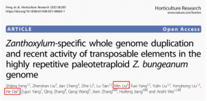 主要內(nèi)容:本研究基于PacBio測序平臺,組裝了4.23 Gb花椒(鳳椒)基因組,并基于Hi-C技術(shù)將98%序列掛載至68條染色體上。比較基因組分析研究了揭示花椒在2,600萬年前經(jīng)歷了一次獨(dú)立的全基因組復(fù)制事件(η-WGD),以及在640萬年前發(fā)生了轉(zhuǎn)座子爆發(fā)事件,這系列事件造成了花椒大量基因組擴(kuò)增。作者進(jìn)一步結(jié)合轉(zhuǎn)錄組和代謝組分析表明,顯著的物種特異性基因家族擴(kuò)張和基因表達(dá)的變化影響了花椒麻味物質(zhì)、單萜類物質(zhì)和花青素的生物合成,并繪制了花椒麻味物質(zhì)合成的代謝通路圖。該參考基因組為研究近期轉(zhuǎn)座子擴(kuò)增和全基因組復(fù)制事件對基因得失和基因組重建的影響提供了有價值的模型,并為加速花椒遺傳改良提供了理論基礎(chǔ)。