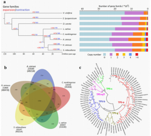 物種演化過程中,往往伴隨著基因家族的擴(kuò)張與收縮,基因家族(gene family)是來源于同一個祖先,由一個基因通過基因重復(fù)而產(chǎn)生兩個或更多的拷貝而構(gòu)成的一組基因,它們在結(jié)構(gòu)和功能上具有明顯的相似性,編碼相似的蛋白質(zhì)產(chǎn)物。而特定基因家族的擴(kuò)張可能在促進(jìn)植物表型多樣化和新性狀進(jìn)化中發(fā)揮重要作用。通過與具有相似/相反生物學(xué)功能的近緣物種比較,獲得相關(guān)基因家族,并將選擇其中某種擴(kuò)張基因家族聯(lián)合轉(zhuǎn)錄組差異表達(dá)以及代謝組,可以深度挖掘目的物種重要性狀形成機(jī)制與重要代謝通路。該研究方法是中藥、花卉、蔬果等植物研究中的重要環(huán)節(jié)。