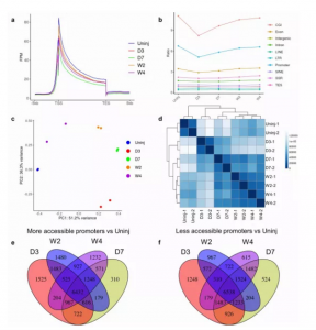 ATAC-seq:新鮮分選的來自小鼠未受傷心肌和心肌梗死后第3天、第7天、第2周、第4周梗死區(qū)的心臟成纖維細(xì)胞,每組設(shè)置兩個重復(fù)