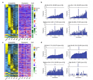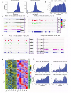 然后根據(jù)檢測到的啟動子的可及性對它們進(jìn)行分類:高可及性組,低可及性組和動態(tài)可及性組。發(fā)現(xiàn)在三個組中,很多基因的啟動子可及性和轉(zhuǎn)錄水平有很強(qiáng)的相關(guān)性,但是在高可及性組中有一些基因的啟動子可及性和轉(zhuǎn)錄組水平有著較弱的或者無相關(guān)性。有趣的是,具有高啟動子可及性的基因具有最高的CpG密度,而具有低啟動子可及性的基因具有最低的CpG密度(圖4g)。當(dāng)根據(jù)啟動子中的CpG密度將5,431個差異表達(dá)基因分為3組時,發(fā)現(xiàn)CpG密度較低但具有很強(qiáng)的正相關(guān)性的基因占比最高,進(jìn)一步表明DNA甲基化可以獨立調(diào)控基因轉(zhuǎn)錄,而與啟動子染色質(zhì)可及性無關(guān)(圖4h)。
