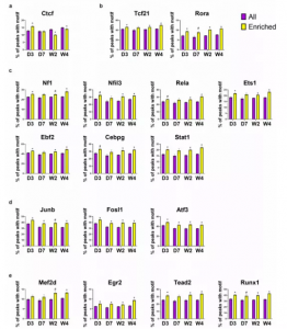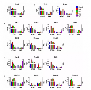 接下來分析每個分組中這17個TF motif在遠(yuǎn)端ATAC-seq 峰中的結(jié)合位點,發(fā)現(xiàn)與未受傷組相比,對應(yīng)的靶基因在MI后的分組樣本的心臟成纖維細(xì)胞中是上調(diào)的。分析結(jié)果說明除了Ctcf,大多數(shù)MI后的分組樣本中的TF motif在遠(yuǎn)端ATAC-seq峰對應(yīng)的上調(diào)靶基因區(qū)域中的富集程度高于所有遠(yuǎn)端ATAC-seq峰(圖7a-e)。