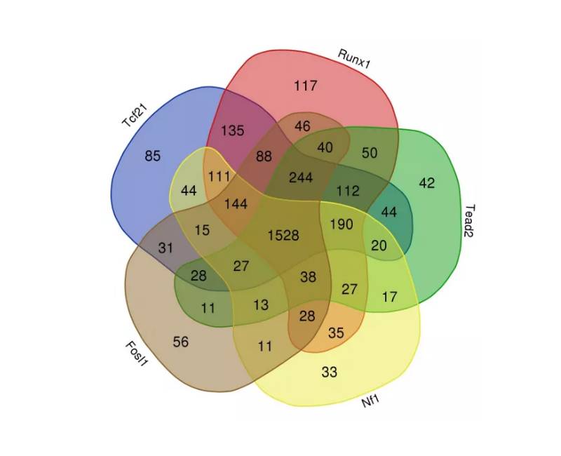 單個TF靶向的差異表達(dá)基因的比較結(jié)果揭示在Tcf21、Runx1、Tead2、Nf1 和 Fosl1 之間有著最大的交集(圖 8),表明許多與MI后心臟成纖維細(xì)胞的激活和分化相關(guān)的基因是受多個關(guān)鍵TF共同調(diào)節(jié)的。