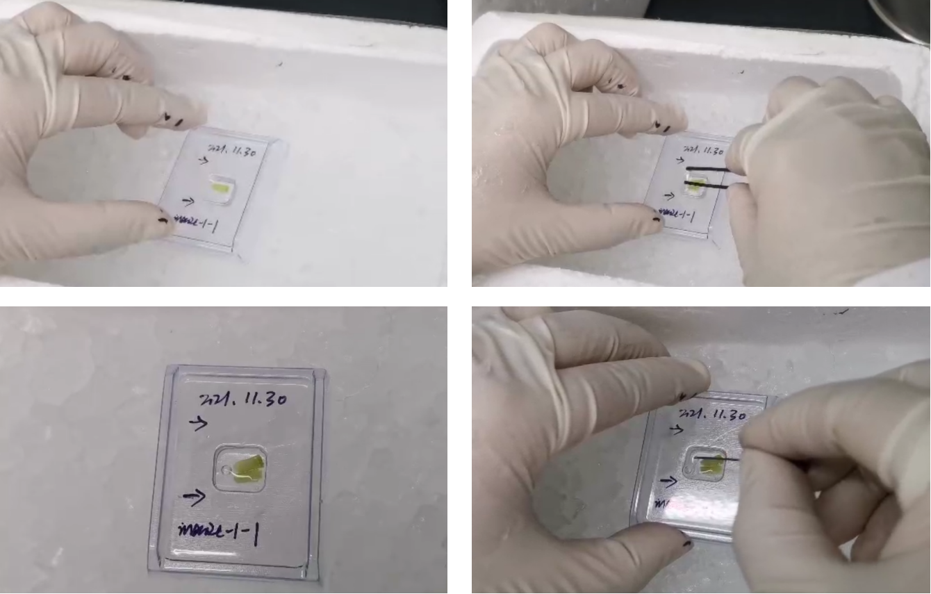 在冰上操作,用鑷子輕輕夾住組織,緩慢加入預冷的OCT包埋劑,直至OCT完全包裹組織,并調(diào)整組織在OCT中的位置,保證目標平面與切面水平一致,尤其是多個組織包埋一定要排列整齊,避免重疊在一起,此過程中避免產(chǎn)生氣泡,如有氣泡產(chǎn)生用用針尖輕緩挑出氣泡。